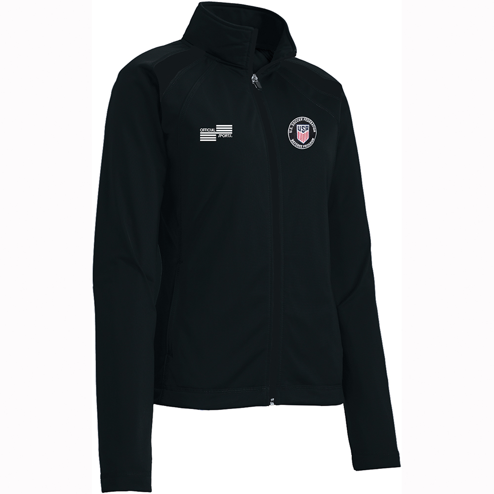 Widely popular, classic all black warm-up jacket perfect for fourth officials! Athletic styling with gentle contoured silhouette, stand-up collar, side zippered pockets and an open hem with drawcord. Pair it with our #W1270PCL USSF Women's Tapered Pants or our #1161PCL USSF Tapered Joggers to complete your look.